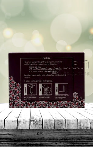 Cada caja contiene 1,000 agujas para acupuntura con entorchado coreano "spring handle" en acero inoxidable, conteniendo pequeños paquetes de 10 piezas con un aplicador.