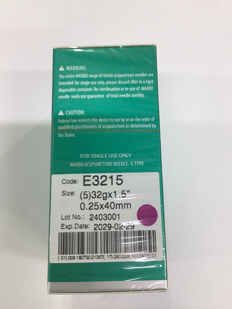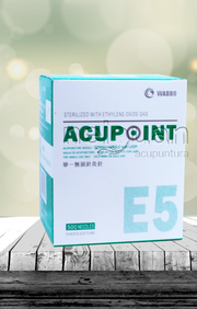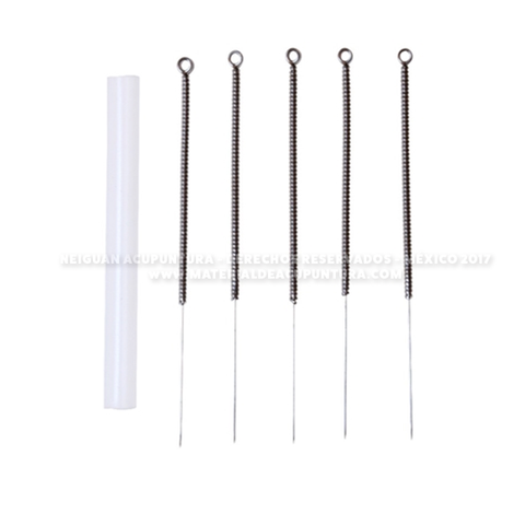 Agujas para acupuntura con entorchado y cuerpo de acero inoxidable grado médico de la línea E-5. Cada paquete cuenta con cinco agujas y un aplicador.