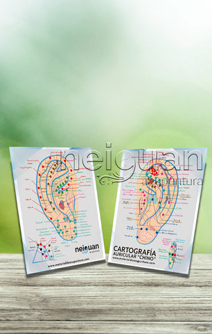 Material didáctico para el estudio y práctica de la auriculoterapia, el cual muestra la cartografía auricular basada en el sistema chino, donde podemos apreciar las zonas de la aurícula tanto derecha como izquierda.