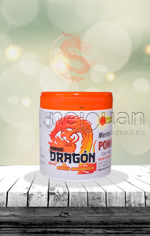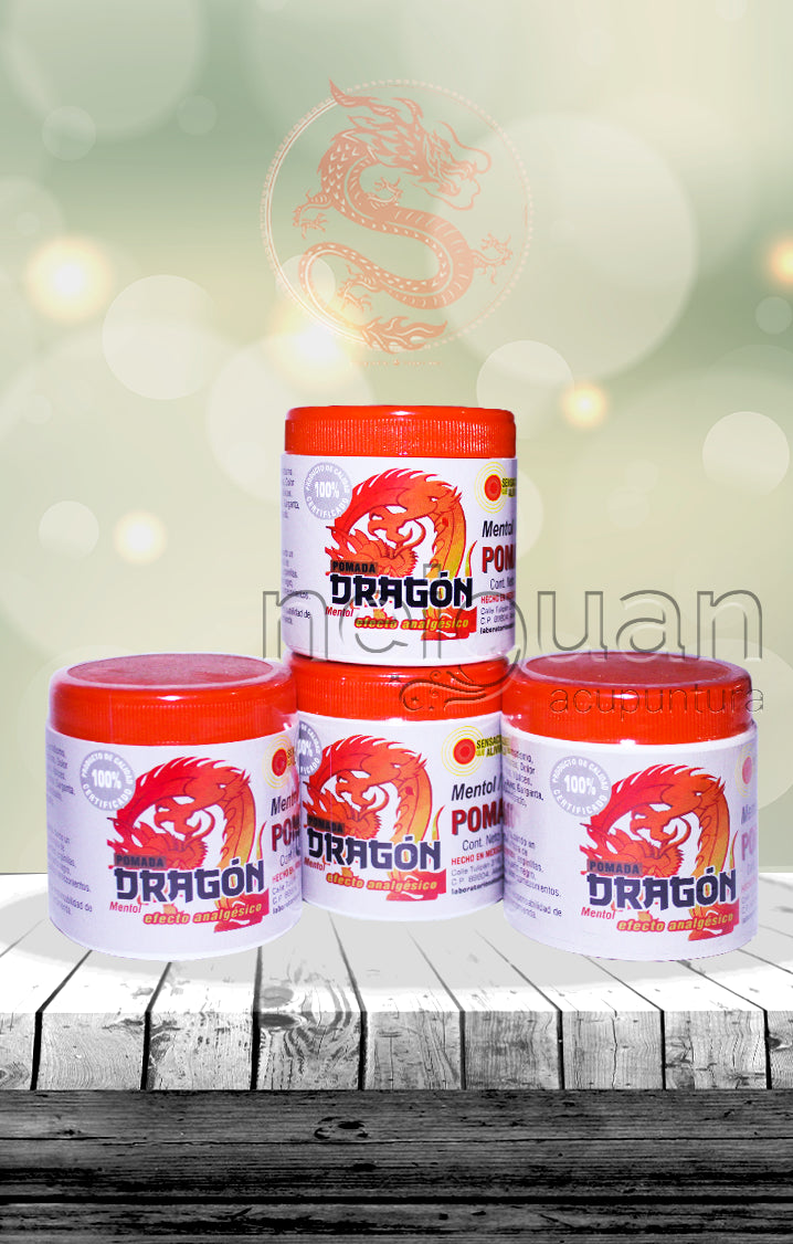 La Pomada "Dragón" con mentol y efecto analgésico es eficaz en curaciones de reumatismo, calambres, golpes, torceduras, dolor de espalda, cadera, cintura, várices, inflamación del vientre, pecho, garganta, anginas, tos, catarro, constipado, sinusitis, asma y bronquitis. Sólo frote en la parte interna dando un vigoroso masaje por 5 minutos a la hora de acostarse. En caso de barros, espinillas, manchas en la cara como paño negro, hongos, jiotes, acné, granitos, comezón etc. El uso de este producto es responsabilidad de quien lo usa y de quien lo recomienda.