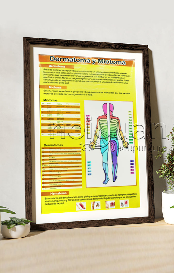 Laminilla profesional tamaño cartel (86x55cm) impresa en papel couché de 90Grs con información básica del miotoma y dermatoma.